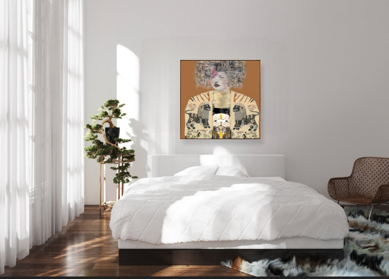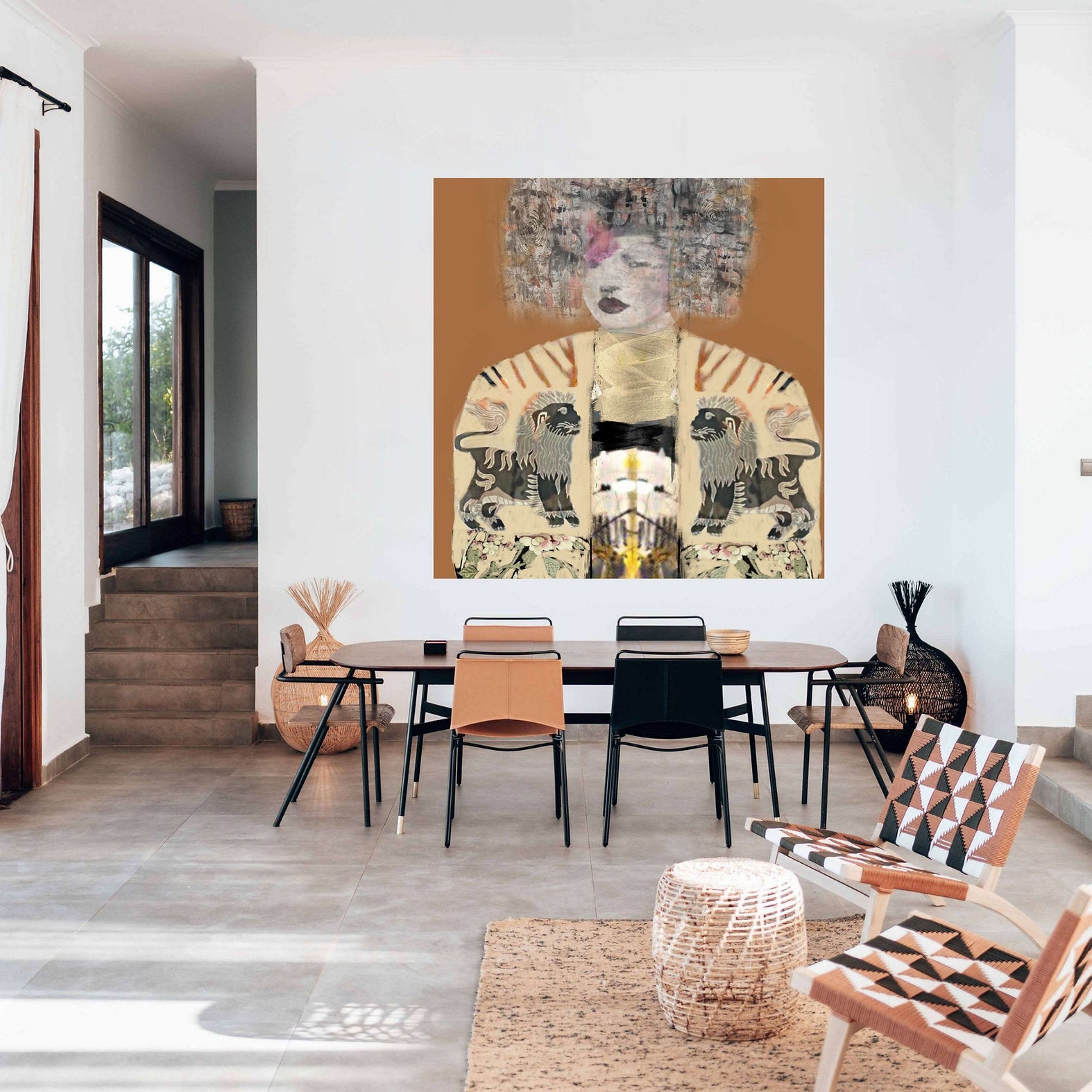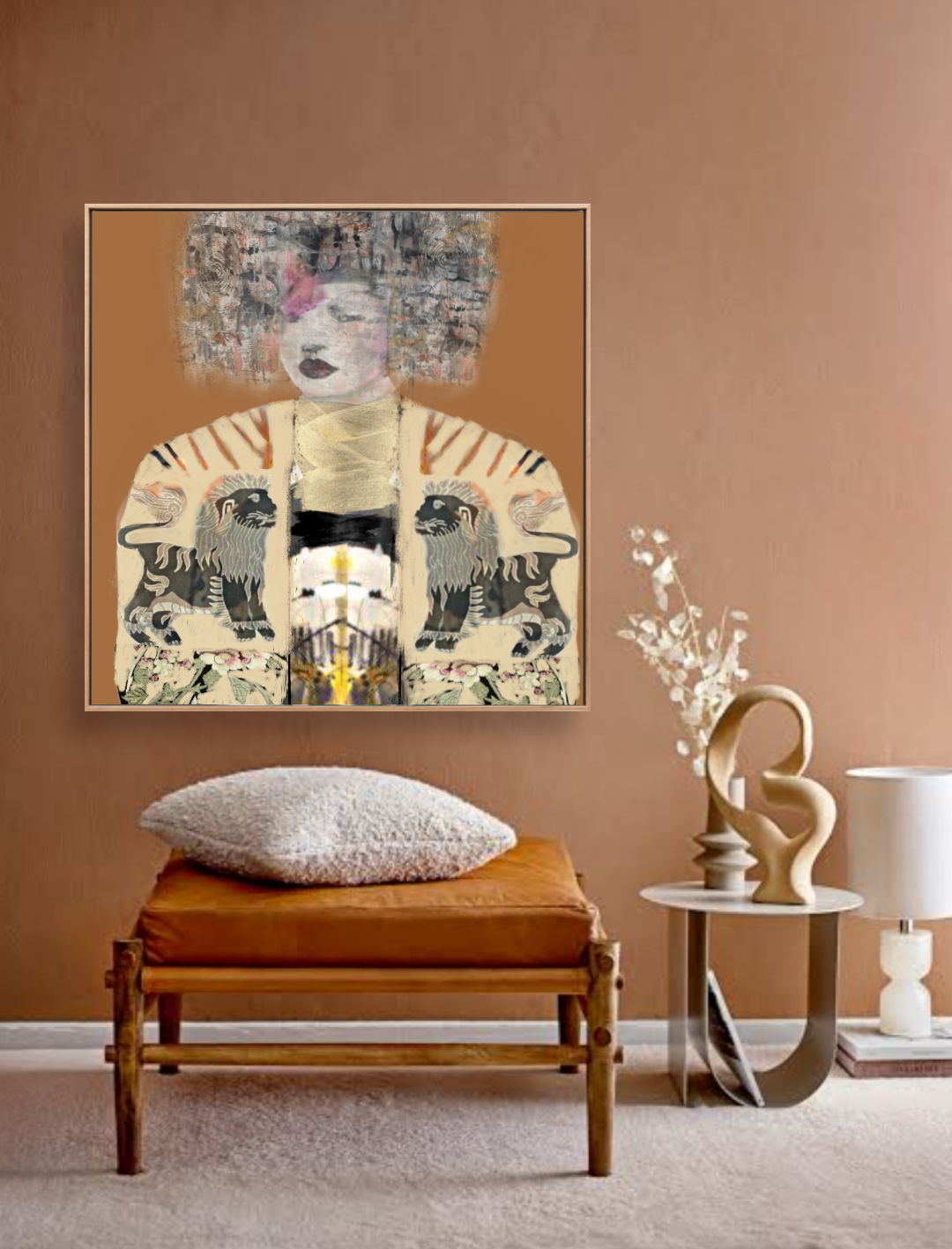 Enigmatic Asian inspired neutral art print. Vintage tiger patterned coat. Mustard, charcoals with intricate patterns.