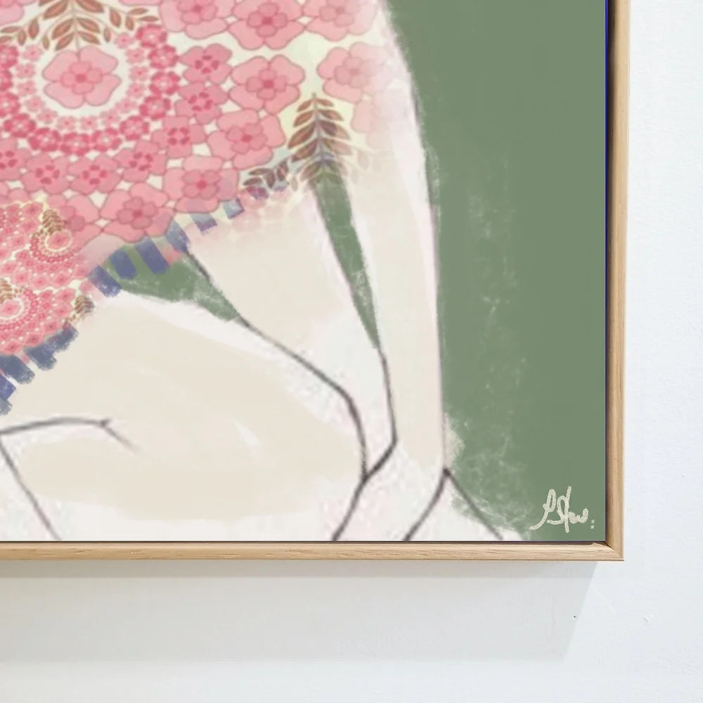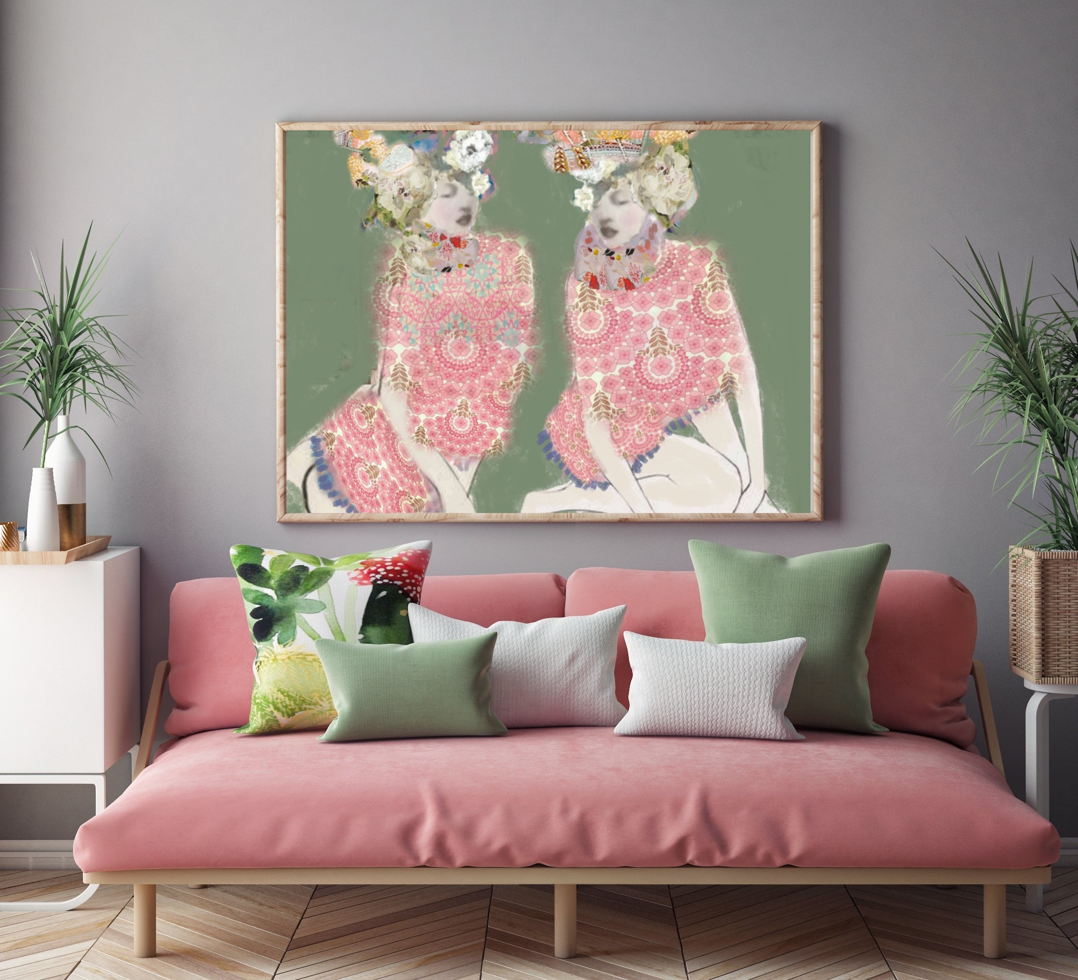 Boho twins is a relaxed and simple illustration depicting just being in the moment. A casual and beautiful print. Designed digitally with my own patterns and drawings. I love to sit and explore colour and patterns. I join my existing art and collaborate them with old vintage pattens. The image has been professionally photographed to make a modern boho print.