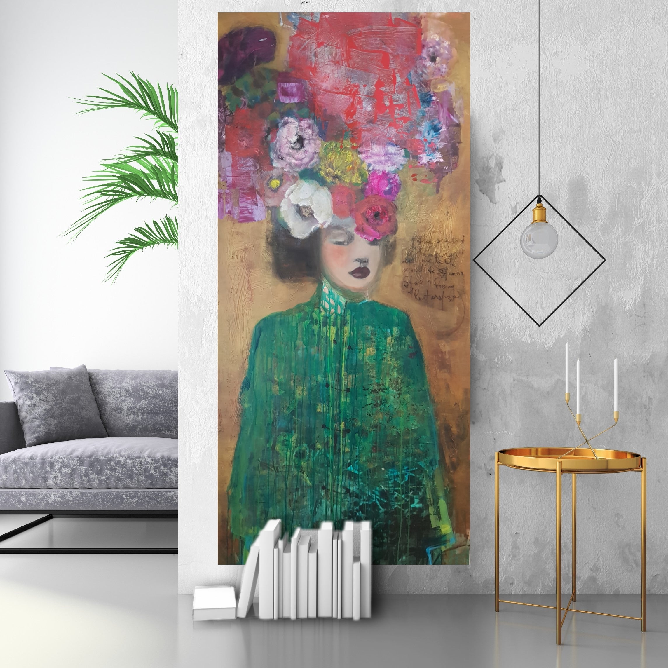 Bring a touch of elegance to your home with our Isabella Japanese Chinoiserie Canvas Art Print. This stunning piece features a beautiful Chinoiserie design, with delicate patterns and bold colours that will instantly elevate any room. Bold and beautiful vintage roses adorn this oriental princess. Isabella was originally painted in a large scale on canvas. Isabella wears her green woven silk tapestry tunic against a rich velvety gold back ground. Inspired by the goddess in you.