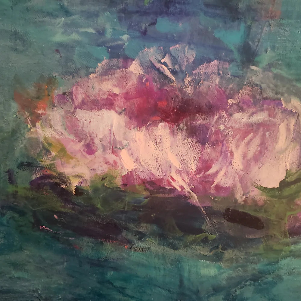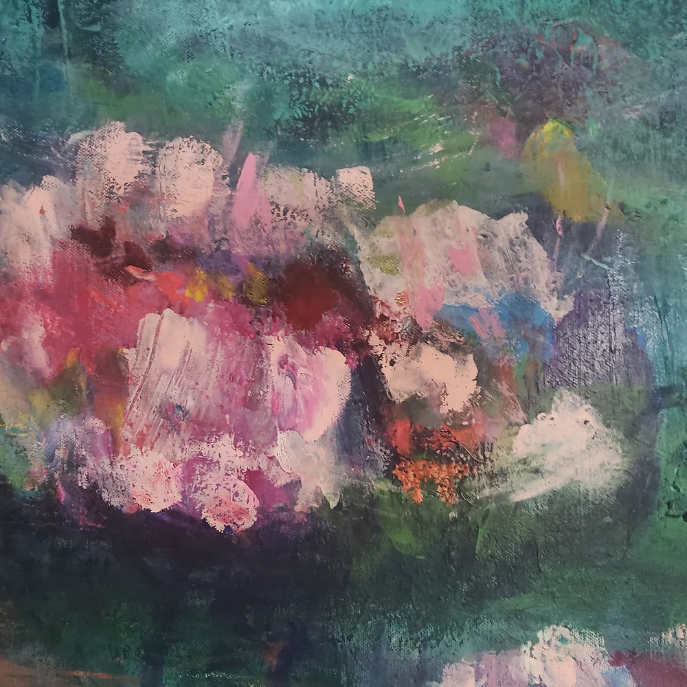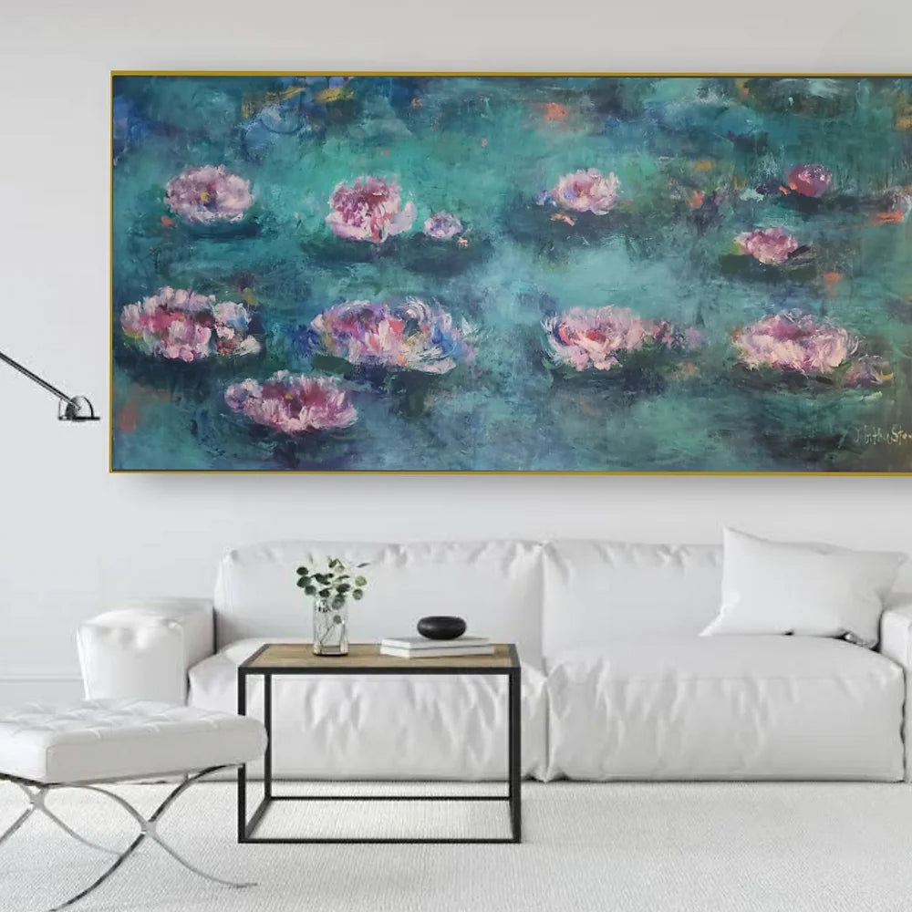 Introducing our stunning Floating Lotus original painting, a beautiful and oversized waterlily masterpiece. This rich green textured painting showcases stunning pale pinks and turquoise blues, creating an eye-catching and mesmerising piece of art.