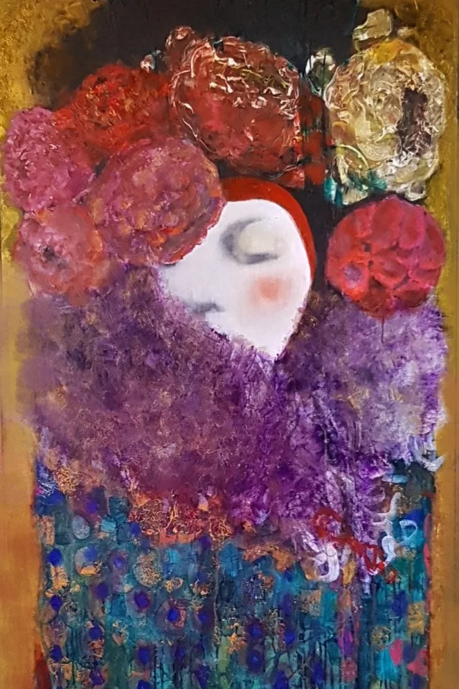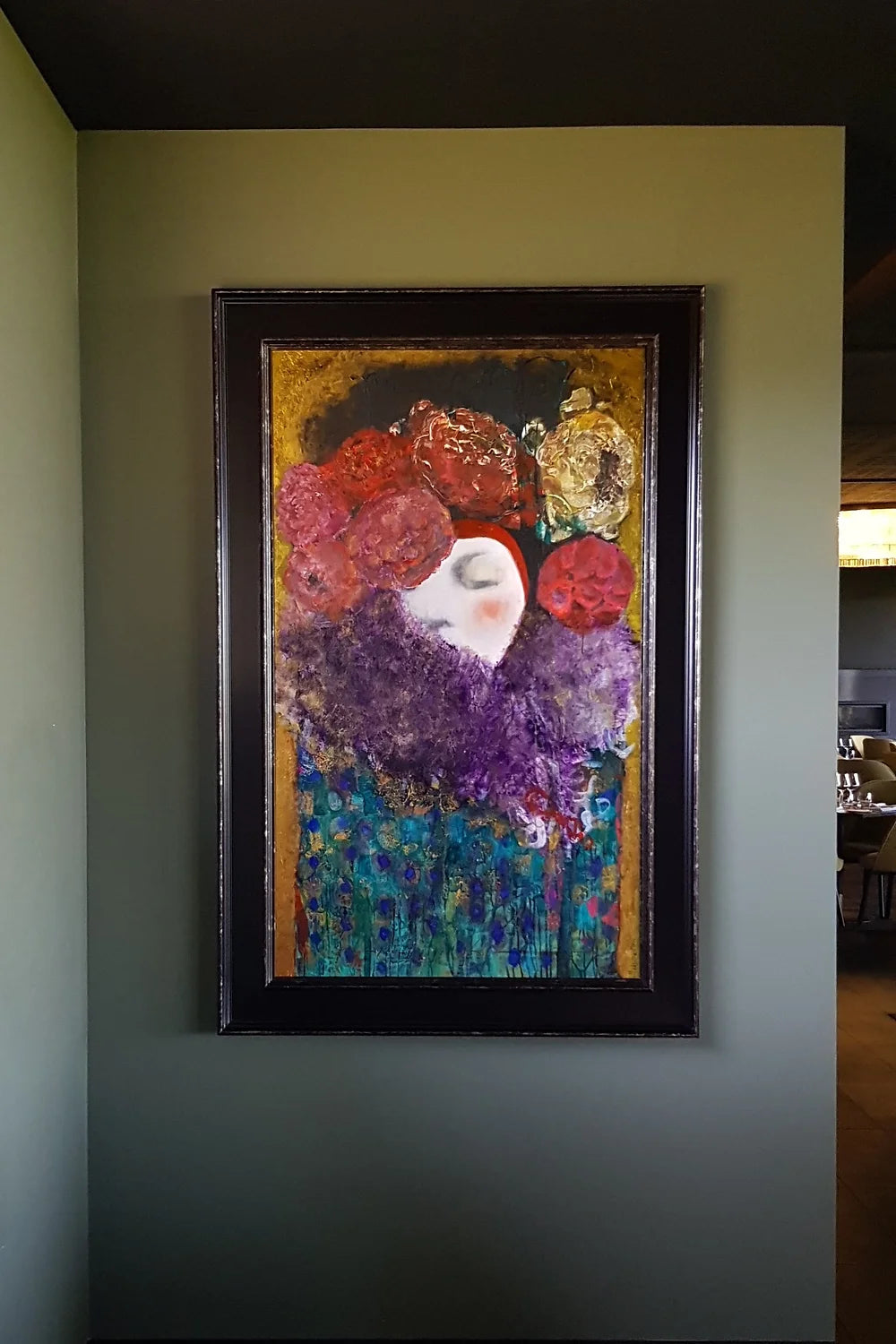 Gigi wears her faux fur lined emerald coat, adorned with roses in her hair. Gold back ground with emerald greens, watermelon pinks, cobalt blues. Framed in Italian wood. Inspired by 1930s.