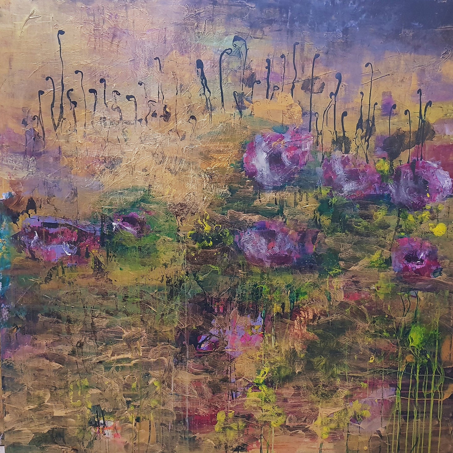 Abstract art painted in acrylic on stretched canvas. Framed in Italian wood ready hang, fuchsia pink velvet lotus flowers floating in a golden water pond with emerald reeds. Thick layered textures.