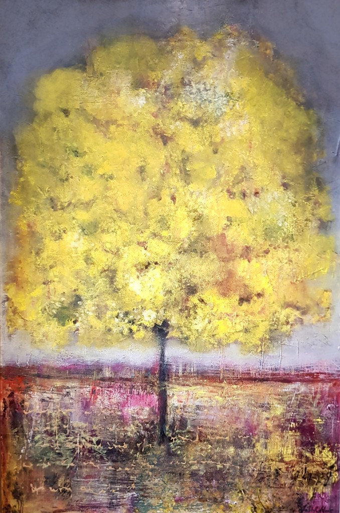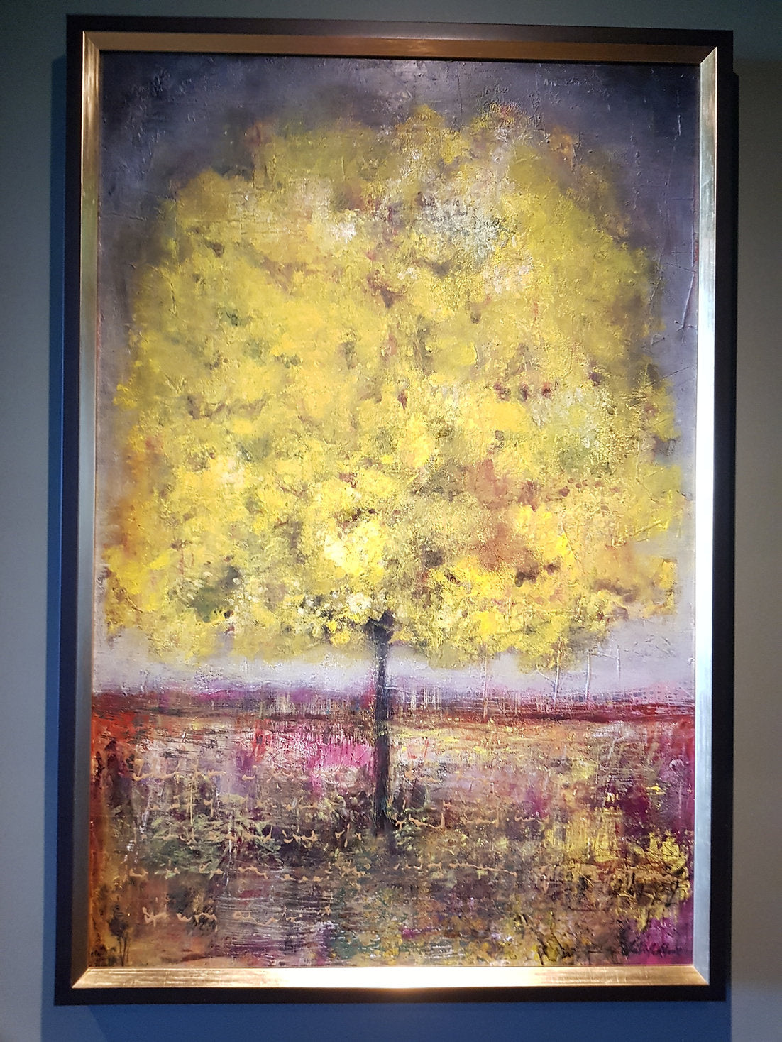 Framed in a Italian wooden box frame with gold inlay. Ready to hang. Painted using high grade acrylic paints. Beautifully textured in coloured layers of saffron, muted greys, golds and splashes of magenta.