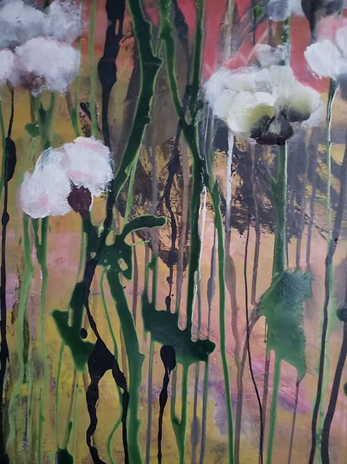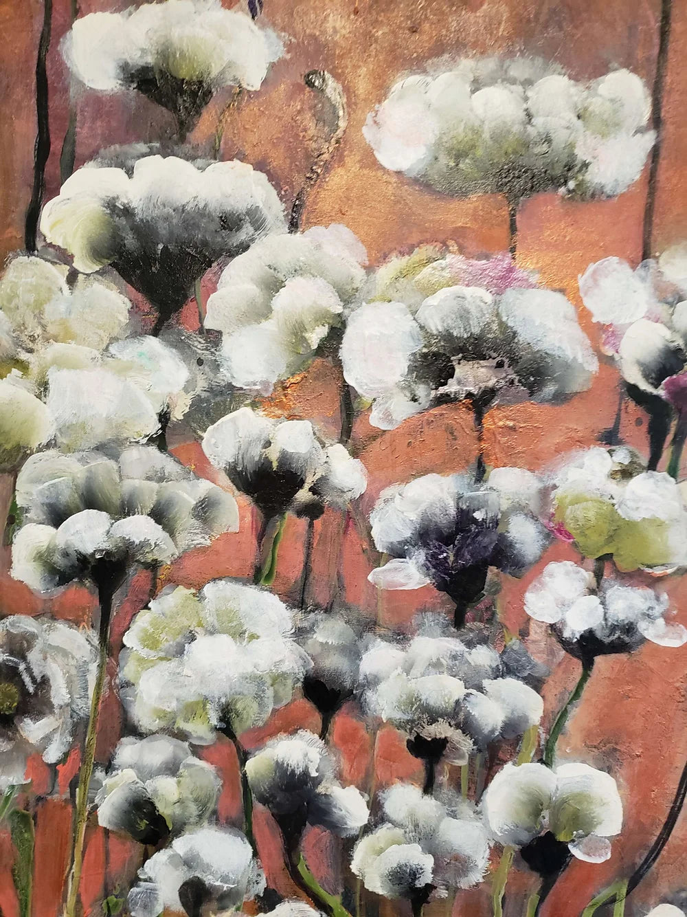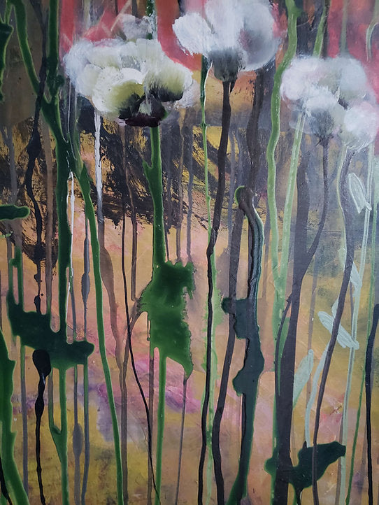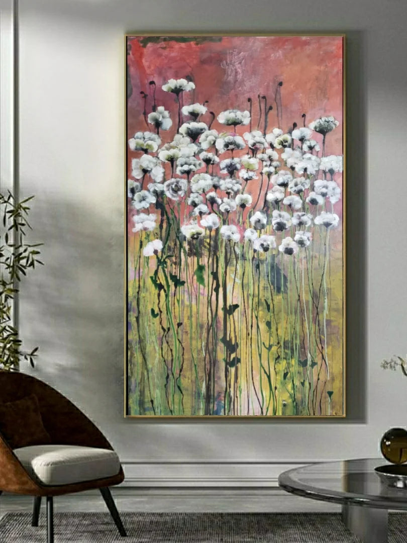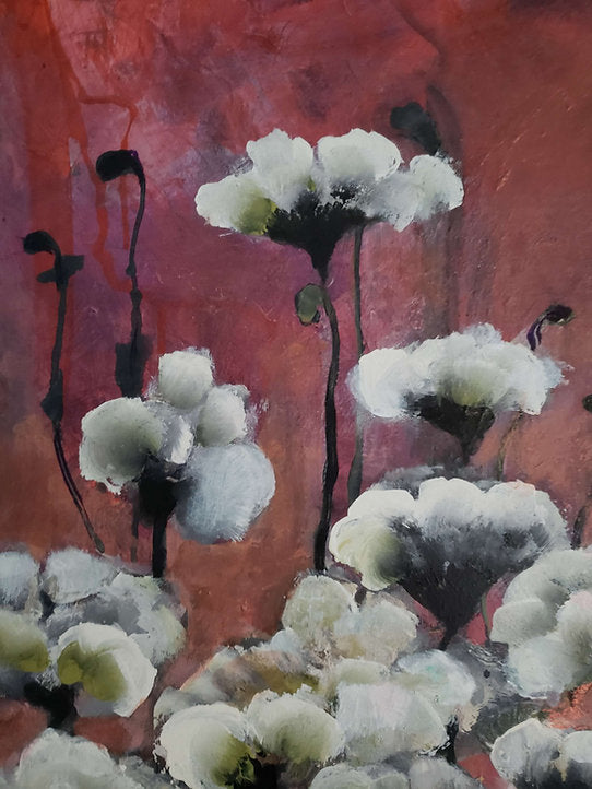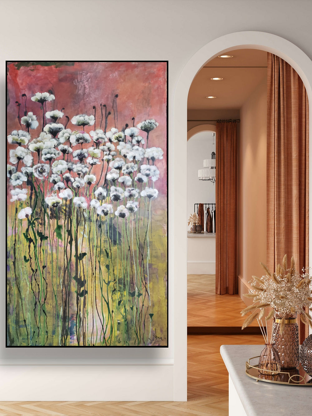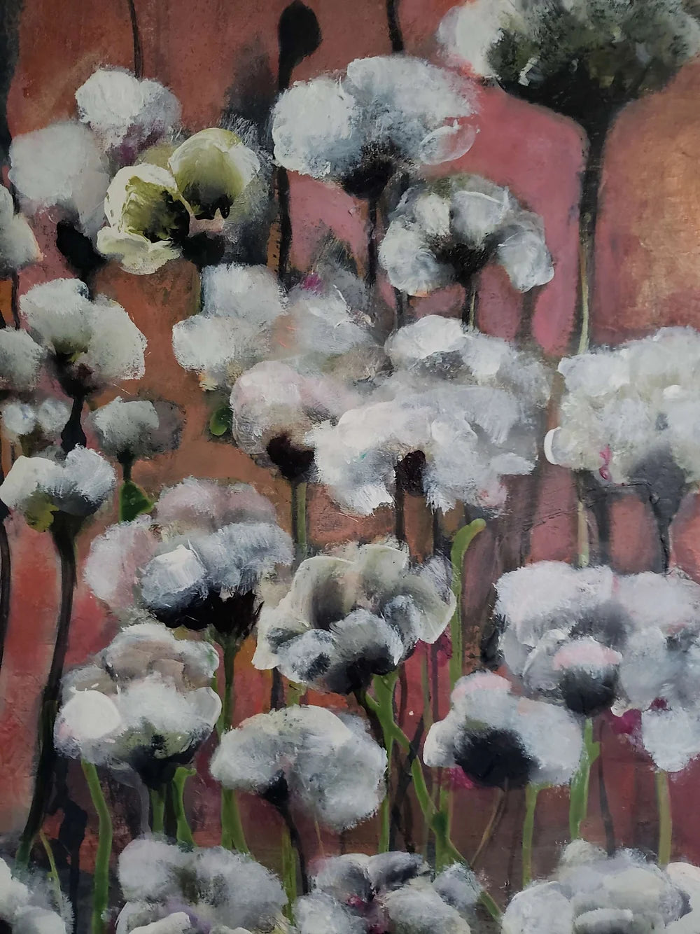 Introducing the stunning Opium Bloom Original Painting, a one-of-a-kind artwork that captures the beauty of tall opium white poppy's in a tangerine peach sky. This layered and textured painting features long green stems bursting through the vibrant sky, creating a sense of depth and movement.