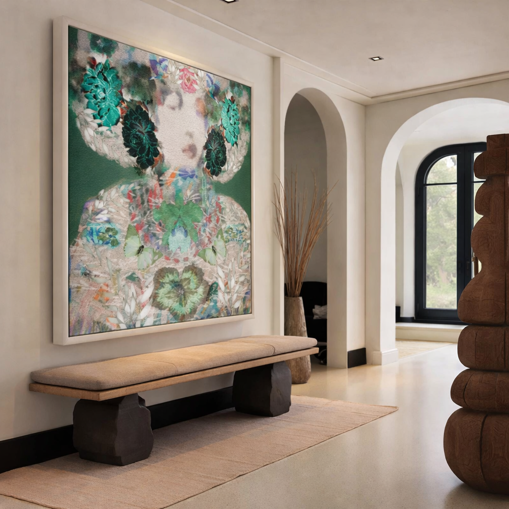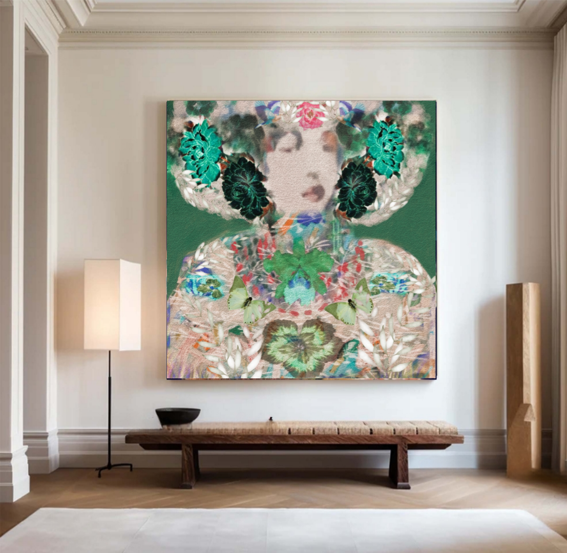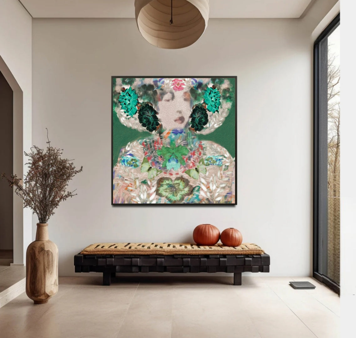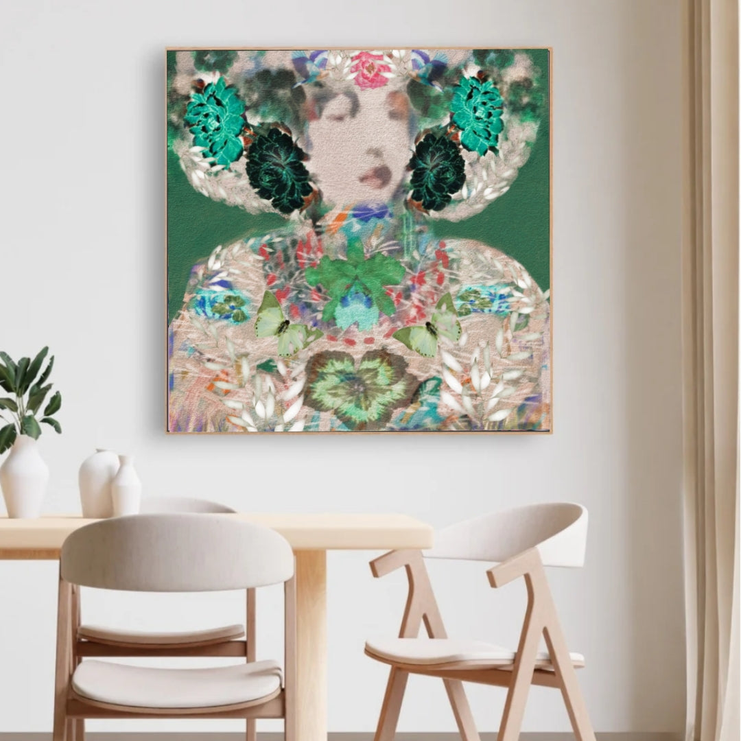 A celebration of the sacred feminine, Divine Alchemy reveals transformation and inner strength. Her face emerges through lush florals and soft greens, symbolising renewal, intuition, and growth. Shadows and muted tones honour mystery and introspection, while vibrant blooms speak to creativity, resilience, and life’s continual alchemy.