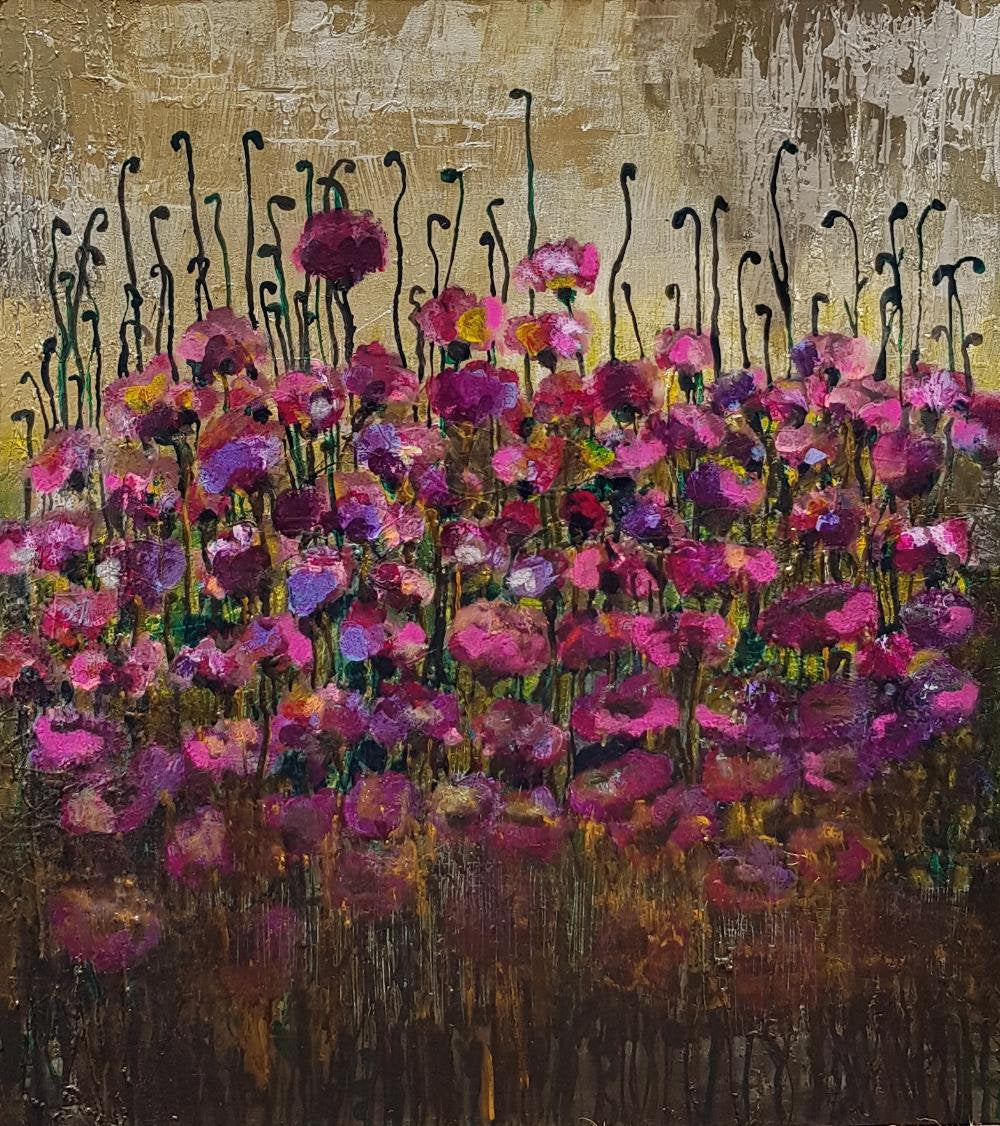 Original hand painted poppies in acrylic stretched on canvas. Velvet poppies was created using thick layers of acrylic and ink. Rich pinks, plums and emerald greens with magenta tones combined with taupes, and golds.